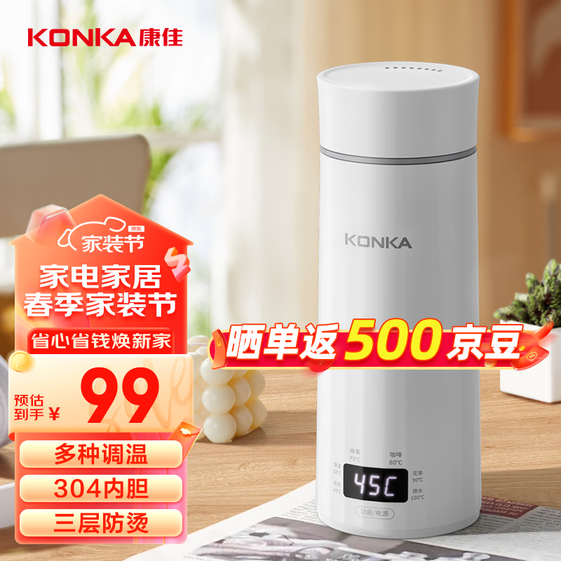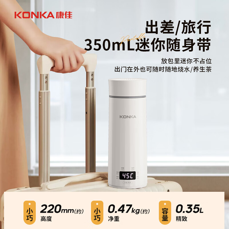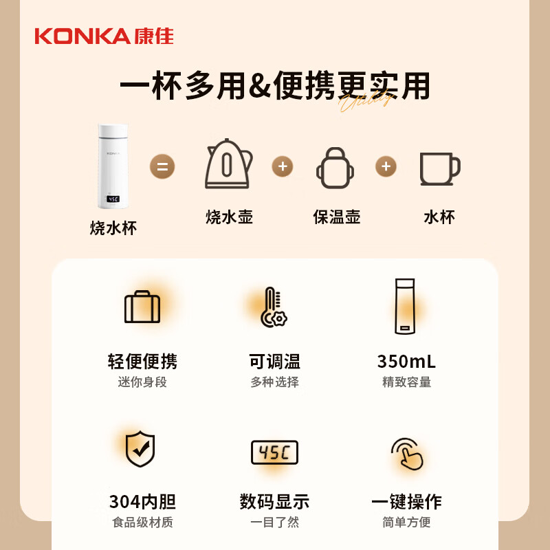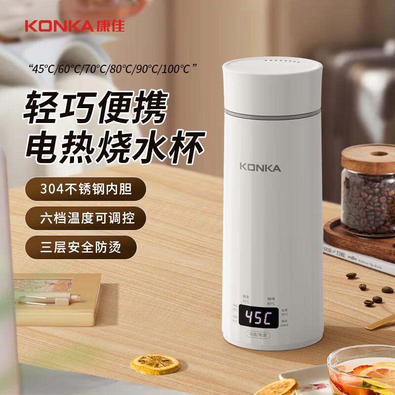 康佳(KONKA)电热水杯便携式迷你烧水壶旅行烧水杯出差加热水杯办公室电炖杯冲奶电热杯可调温 KDRB-0302-W价格:119.00元!