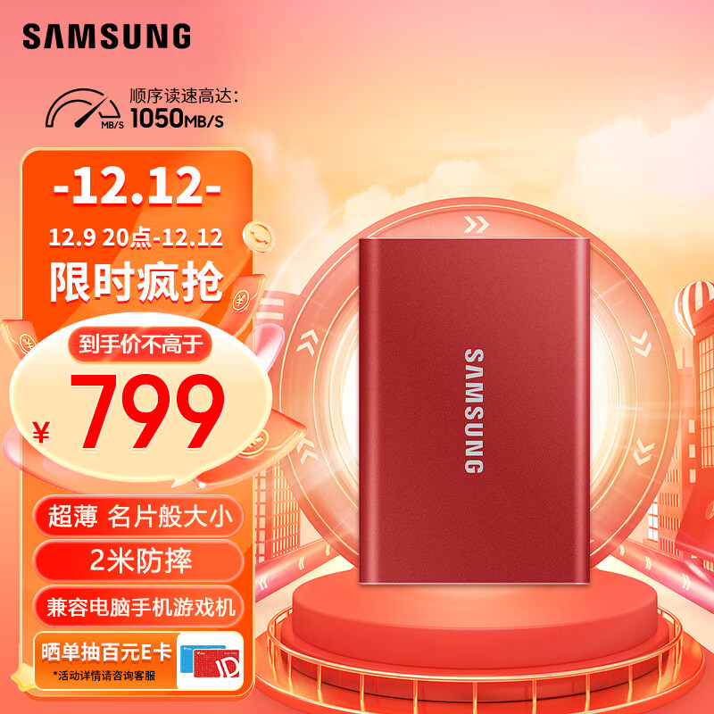 三星(SAMSUNG) 1TB Type-c USB 3.2 移动固态硬盘(PSSD) T7 红色 NVMe传输速度1050MB/s 超薄时尚价格:799.00元!