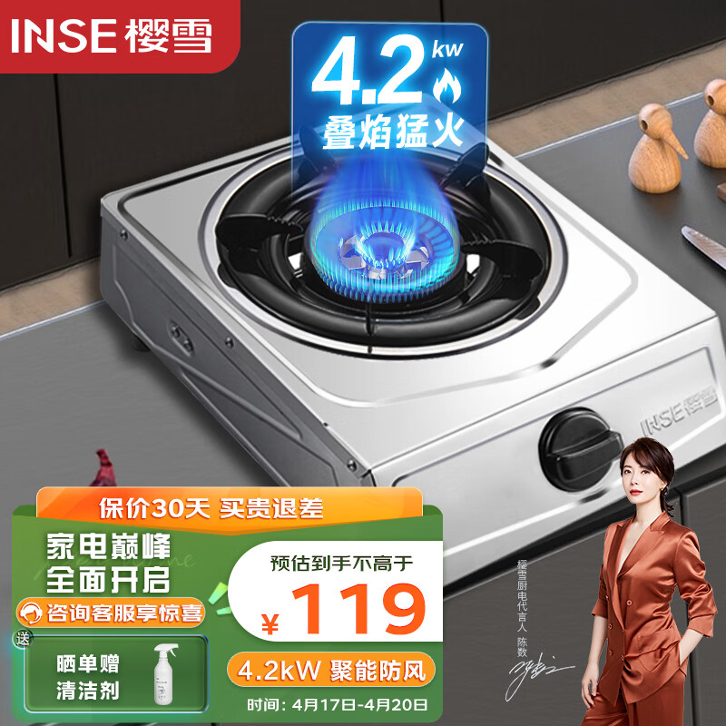 樱雪(INSE)燃气灶单灶 台式不锈钢面板4.2kW火力煤气灶单灶 家用猛火节能单眼灶 JZY-T1501(G)W液化气价格:119.00元!