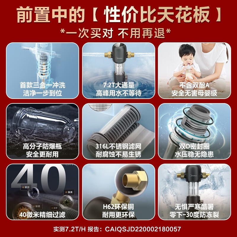 美的(Midea) 前置过滤器净水器7T大通量全屋自来水终身免换滤芯虹吸式高压自动反冲洗净水家用QZBW20S-48前置 【性价比顶配款-7T大通量】价格:599.00元!
