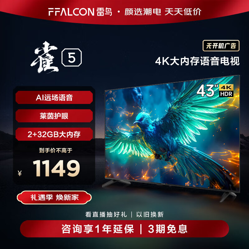 FFALCON雷鸟 雀5 43英寸电视 4K超高清 护眼防蓝光 超薄屏电视 2+32GB 游戏智能液晶电视机43F275C价格:1149.00元!