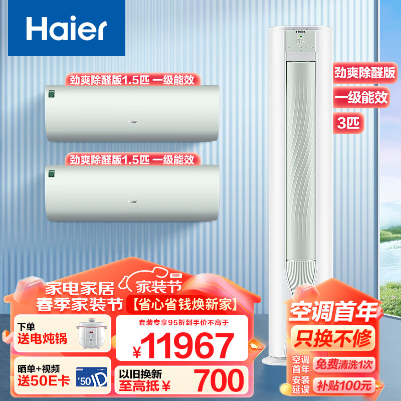 海尔(Haier)劲爽除醛版 新一级能效变频节能 冷暖空调柜机 挂机(1.5匹+ 1.5匹+3匹)两室一厅套装以旧换新价格:11967.00元!