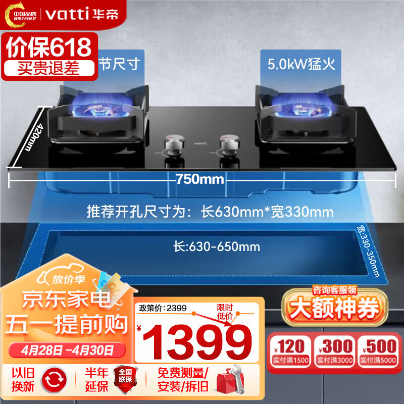 华帝(VATTI)官方燃气灶i10073B燃气灶嵌入式台式双灶具5.0kw猛火灶台多档火力精控一级能效易清洁 i10073B 液化气价格:1399.00元!