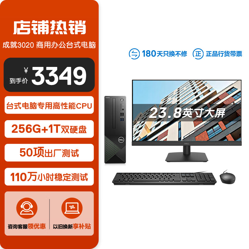 戴尔(Dell)成就3020 台式电脑主机(酷睿13代i3-13100 8G 256GSSD+1TB)23.8英寸大屏显示器 高性能CPU价格:3349.00元!