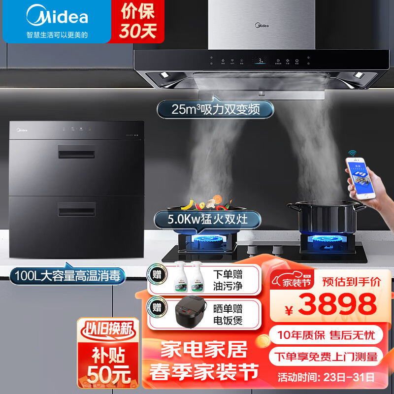 美的(Midea)欧式抽油烟机25立方大吸力双变频950Pa大风压脉冲自清洗家用吸油烟机 TV703烟灶消三件套 [家电]价格:3898.00元!