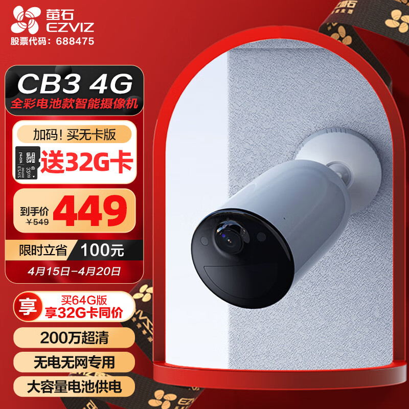 萤石 CB3 4G全彩全无线监控摄像头 200万像素1080P电池相机 内置电信eSIM卡 自带电池 网络摄像机价格:449.00元!