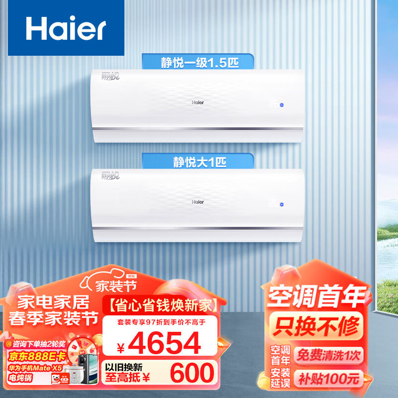 海尔 静悦新一级能效 变频 冷暖 卧室 空调 挂机1.5匹+大1匹空调套装 KFR-35GW/01KGC81U1以旧换新价格:4654.00元!
