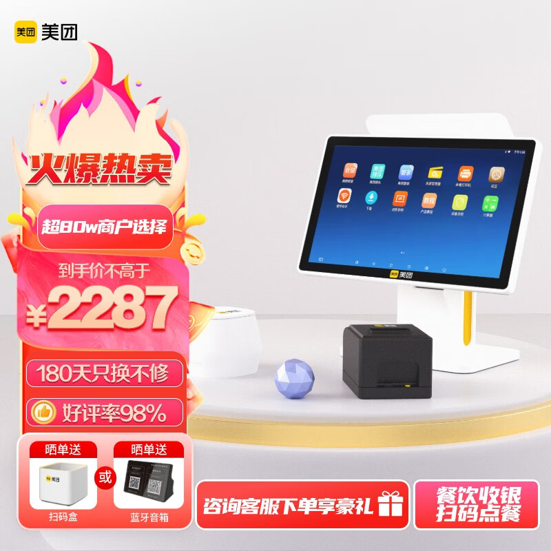 美团 双屏收银机餐饮奶茶店扫码支付超市便利店收银系统(主机+58打印机+标签打印机)双屏套餐五价格:2287.00元!