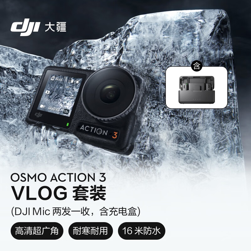 大疆 DJI Osmo Action 3 Vlog 套装(DJI Mic 一拖二) 运动相机 高清防抖Vlog手持摄像机 + 128G内存卡价格:3387.90元!