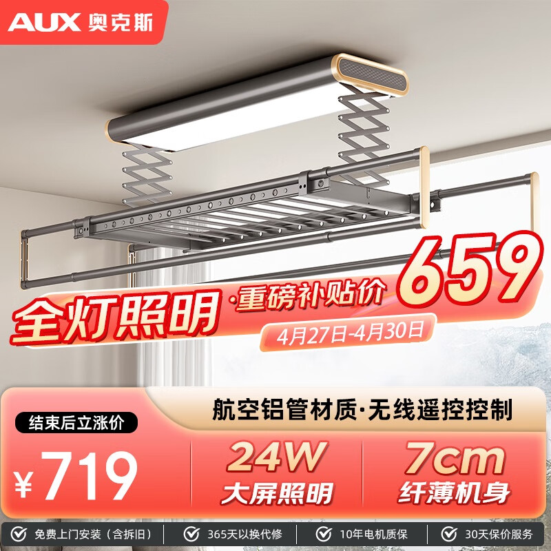 奥克斯(AUX)电动晾衣架升级款自动升降杆阳台室外四杆伸缩遥控LED照明灰EH802价格:719.00元!