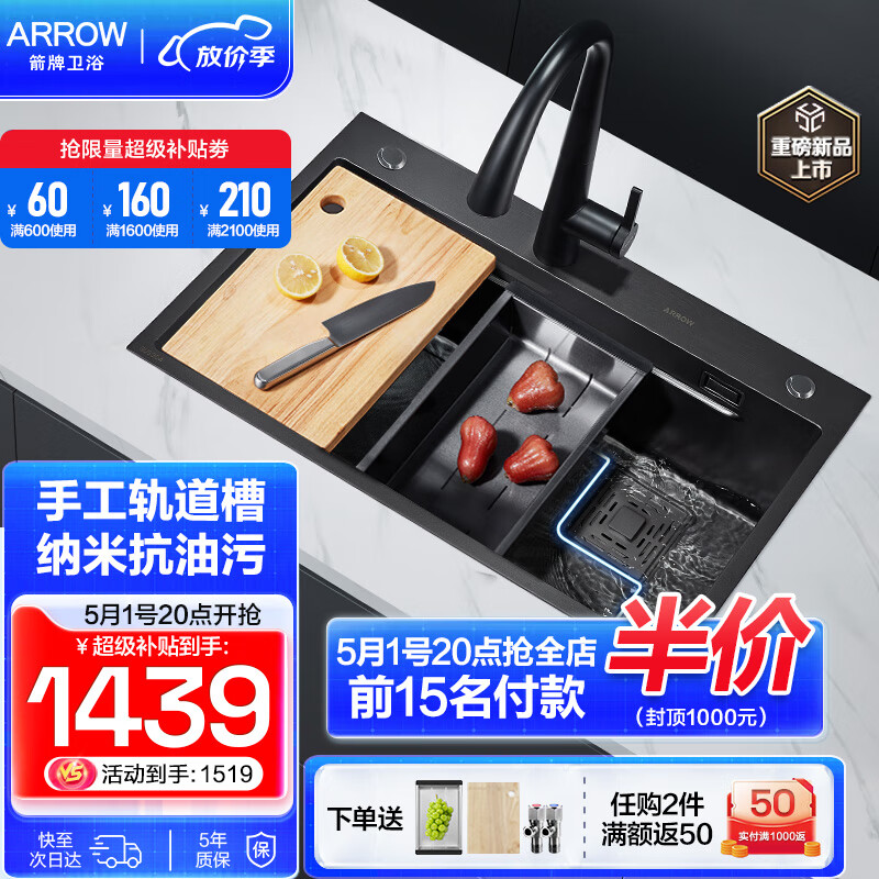 箭牌(ARROW)304不锈钢水槽手工纳米轨道大单槽厨房洗菜盆洗菜池洗碗一体盆 78黑手工纳米轨道槽-含抽拉龙头价格:1786.00元!