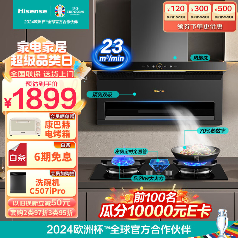 海信(Hisense)油烟机灶具套装 顶侧双吸天然气燃气灶套装 23立方挥手排油烟机5.2kW定时燃气灶DS11+DB33以旧换新价格:2019.00元!