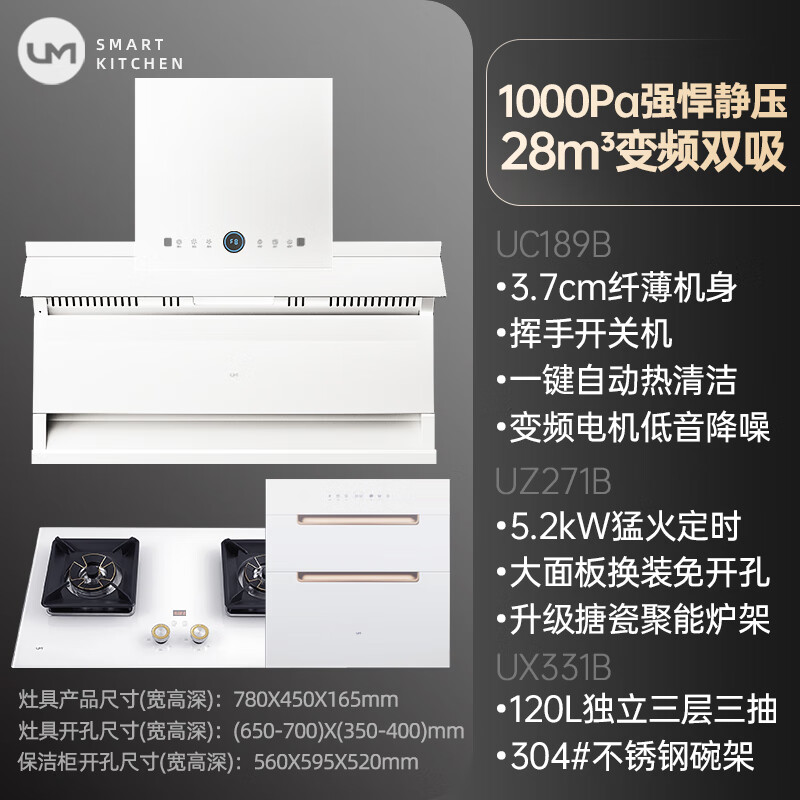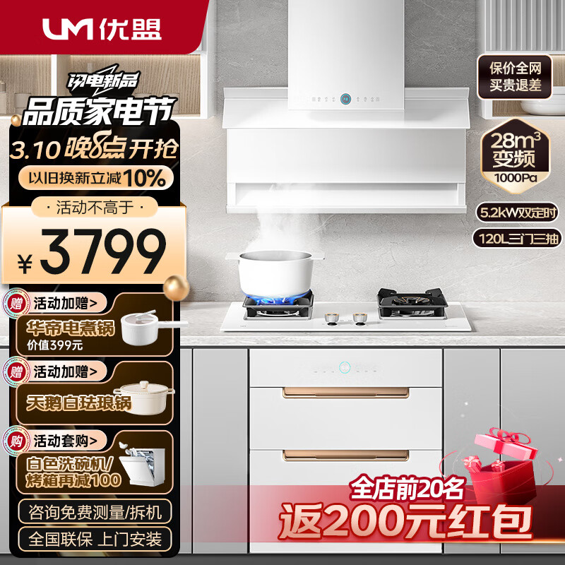 优盟(UM)顶侧双吸油烟机灶具套装自动清洗 白色家用变频大吸力超薄油烟机燃气灶保洁柜烟灶三件套天然气价格:3799.00元!