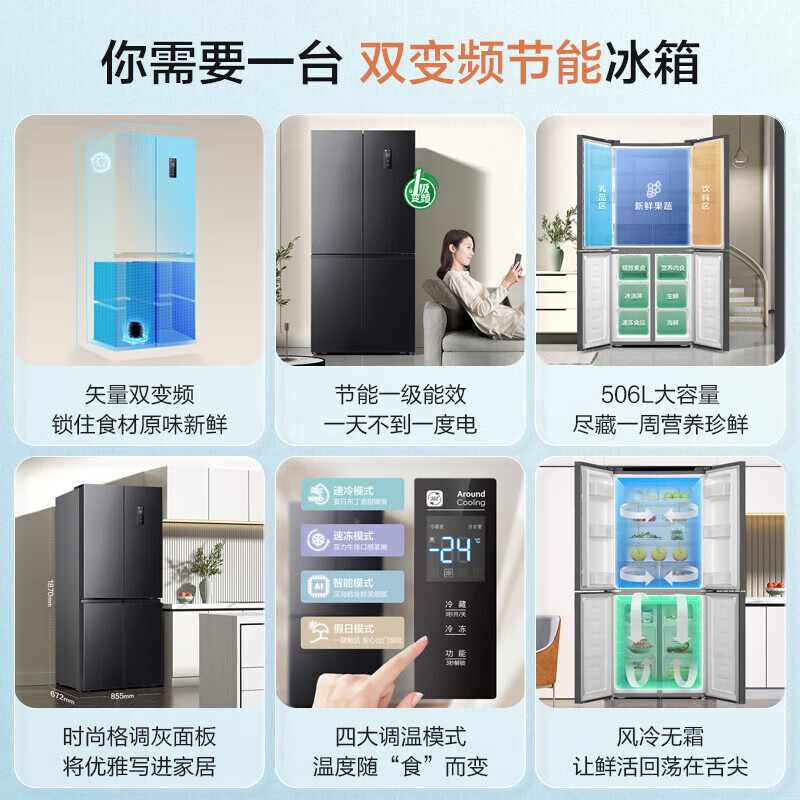 容声506L十字对开门冰箱一级能效超大容量变频节能低噪净味风冷无霜四开门 BCD-506WD12FP 格调灰价格:3299.00元!