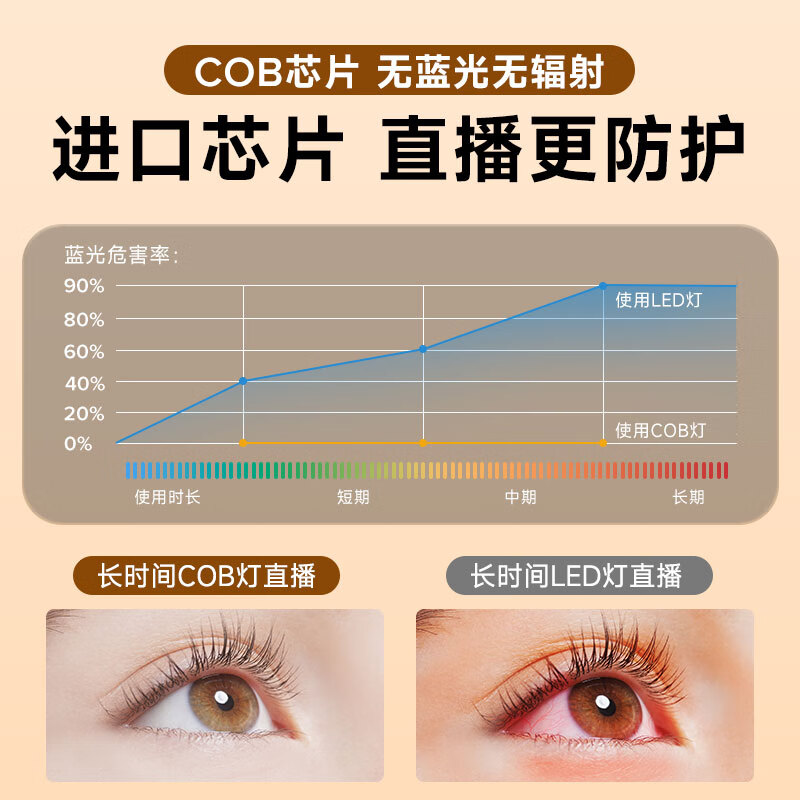 1、直播用的,打起来的灯光非常好,人物丰满,对着白底的墙面反光也不严重,总的来说还是不错的,部门的人反馈这个品牌的质量也不错,以后再需要的话会重复购买