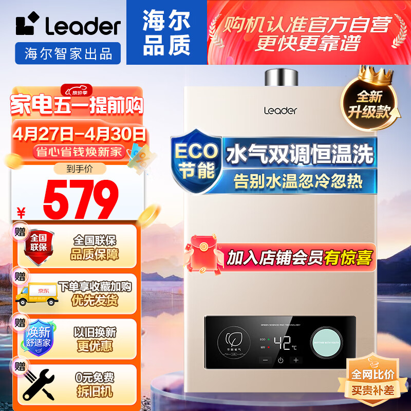 海尔智家出品 Leader燃气热水器12升家用天然气智能恒温水气双调三重智能 抗风防冻 JSQ22-12LVS(12T)价格:929.00元!