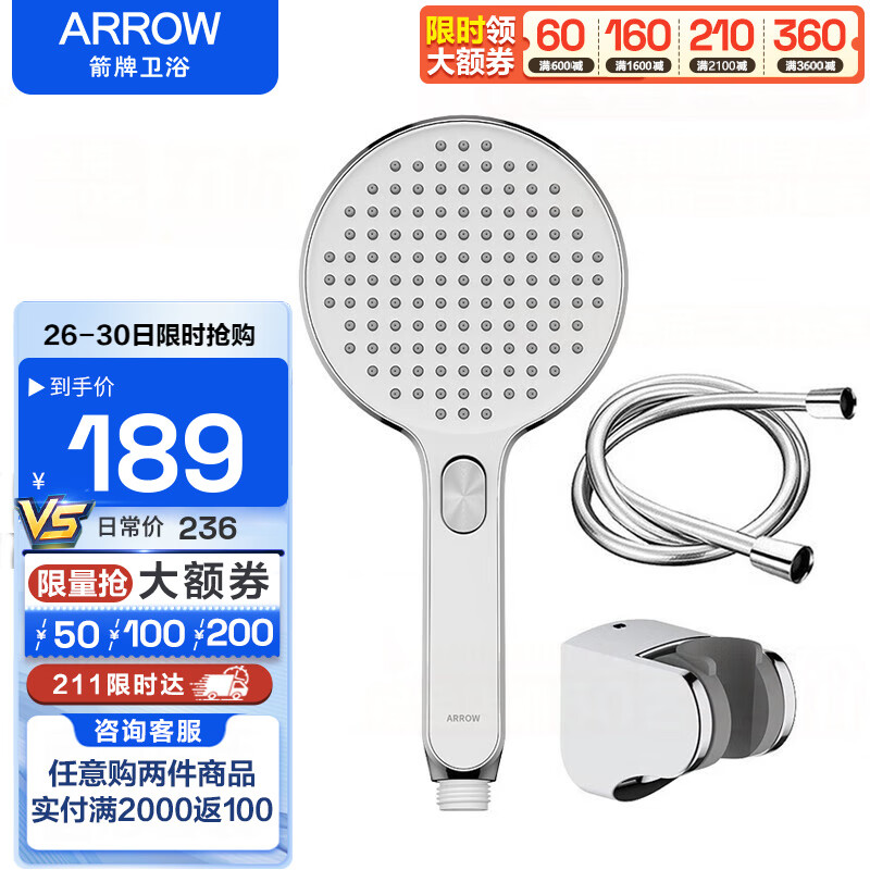 箭牌(ARROW)手持花洒套装增压宽屏超大加厚面板淋浴手持莲蓬头花洒喷头 增压加厚手持套装(圆形)价格:236.25元!