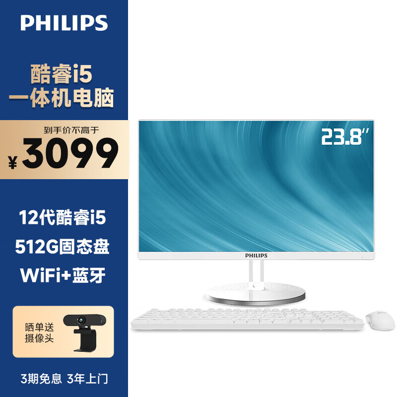 飞利浦S9 23.8英寸台式一体机电脑主机 家用网课八核办公整机(12代i5 12450H 16G 512GSSD 双频WiFi)白色价格:3099.00元!