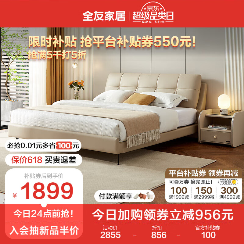 全友家居 真皮艺单人床现代简约次卧室头层牛皮轻奢软包床1.5米105135价格:2855.71元!