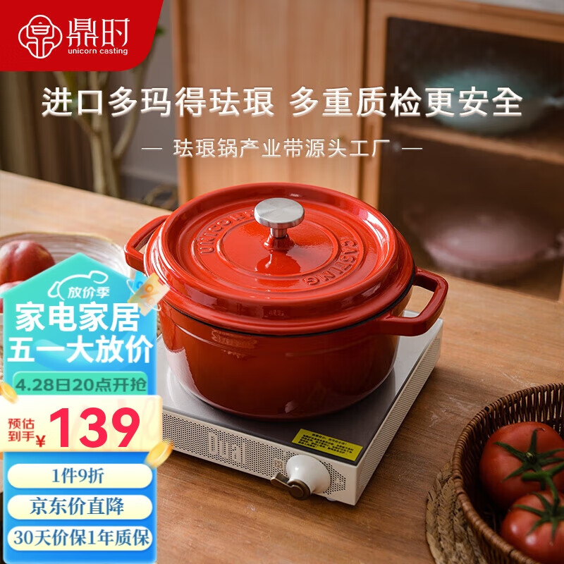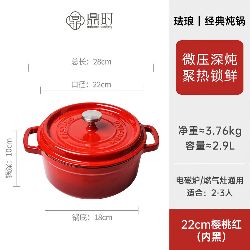 鼎时珐琅锅不易粘铸铁锅平底搪瓷炖锅微压锅电磁炉锅22cm樱桃红汤锅价格:153.00元!