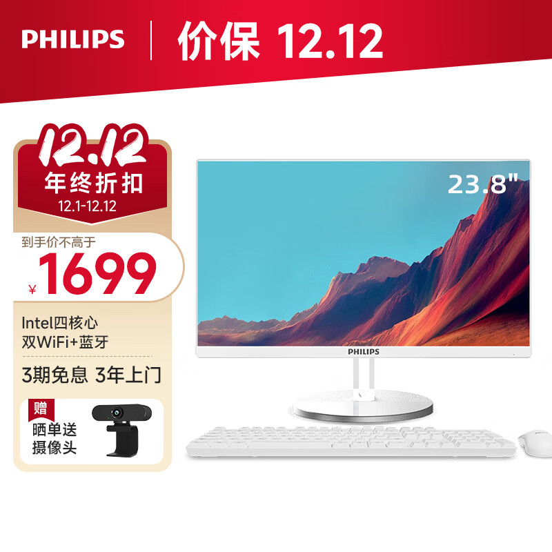 飞利浦S9 23.8英寸台式一体机电脑 商用家用学习办公收银主机(11代4核N5095 8G 256GSSD 双频WiFi)白色价格:1699.00元!
