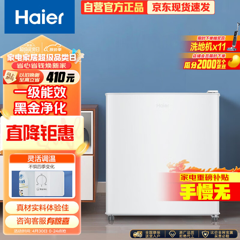 海尔42升单门电冰箱一级能效迷你小户型家用租房宿舍办公室节能省电低音微型冷藏2人可用BC-42GHSDE0W9价格:462.00元!