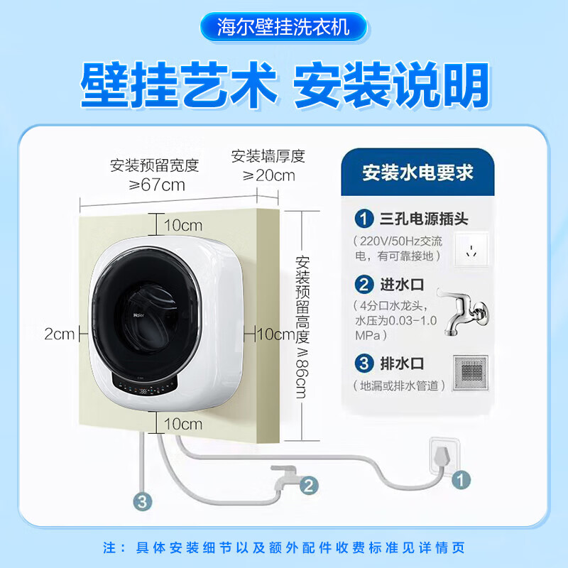 3、买壁挂洗衣机是用来解放双手的,懒人福利。看过了很多测评才买的海尔。下单后送货确实快,师傅也是提前约好的安装时间,安装师傅很细心,还帮忙移了插座,装完后试运行没问题才结束的。洗衣机噪声不大,外观也很不错。