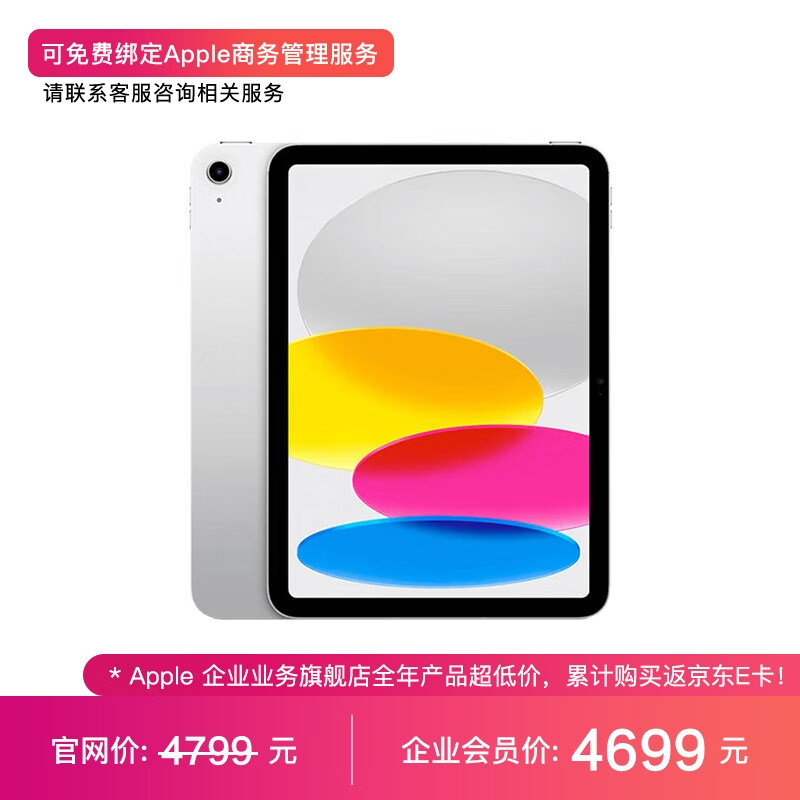 Apple iPad 10.9英寸平板电脑2022年款(256GB WLAN版/A14芯片/1200万像素/iPadOS MPQ83CH/A)银色*企业专享价格:4799.00元!