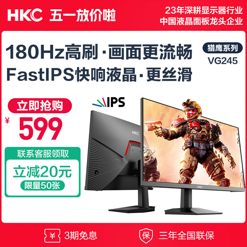 HKC 23.8英寸180Hz高刷FastIPS快速液晶125%sRGB广色域300nit高清1ms小金刚电竞游戏屏幕显示器VG245价格:799.00元!