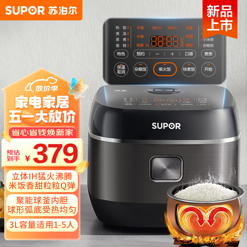 苏泊尔(SUPOR)电饭煲家用3-4个人电饭锅IH加热3L铜晶球釜内胆升级活芯浸泡杂粮饭家用智能电饭煲SF30HC0952价格:379.00元!