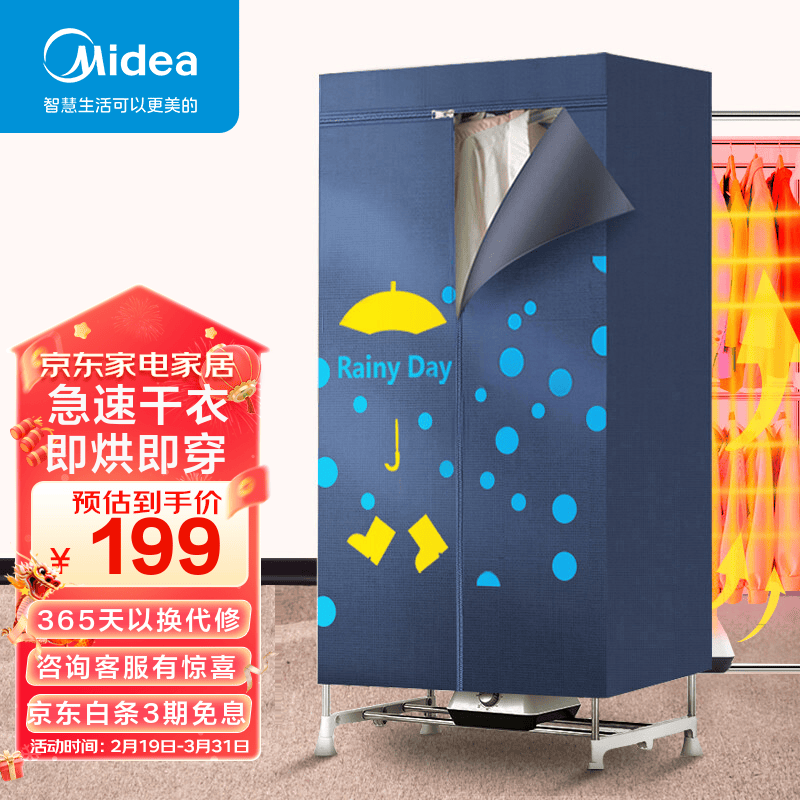 美的(Midea)烘干机家用干衣机小型衣柜式风干烘衣机婴儿衣物暖风30斤大容量定时烘干宿舍衣柜两用 价格:199.00元!