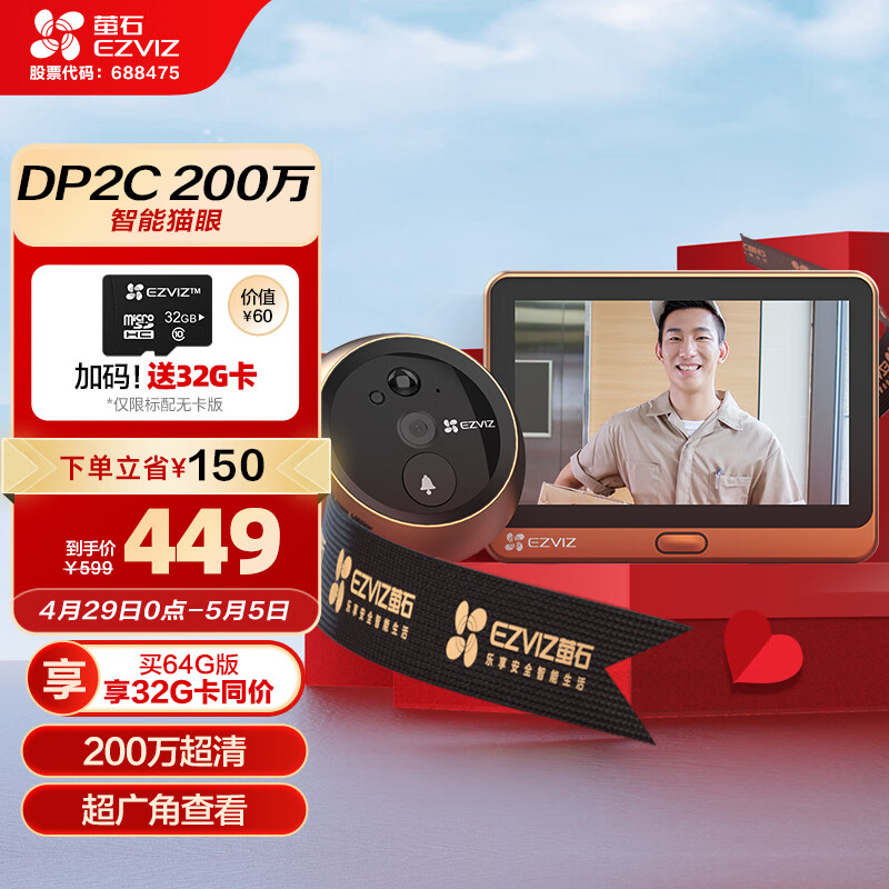 萤石DP2C智能猫眼 摄像头 1080P高清 海康威视旗下电子猫眼 可视门铃防盗门监控 远程可视通话价格:449.00元!