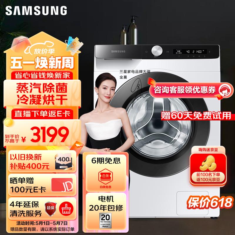 三星(SAMSUNG)10.5公斤全自动滚筒洗衣机洗烘一体机大容量 冷凝烘干蒸汽除菌 泡泡净10公斤洗衣机WD10T504DCE/SC价格:3199.00元!