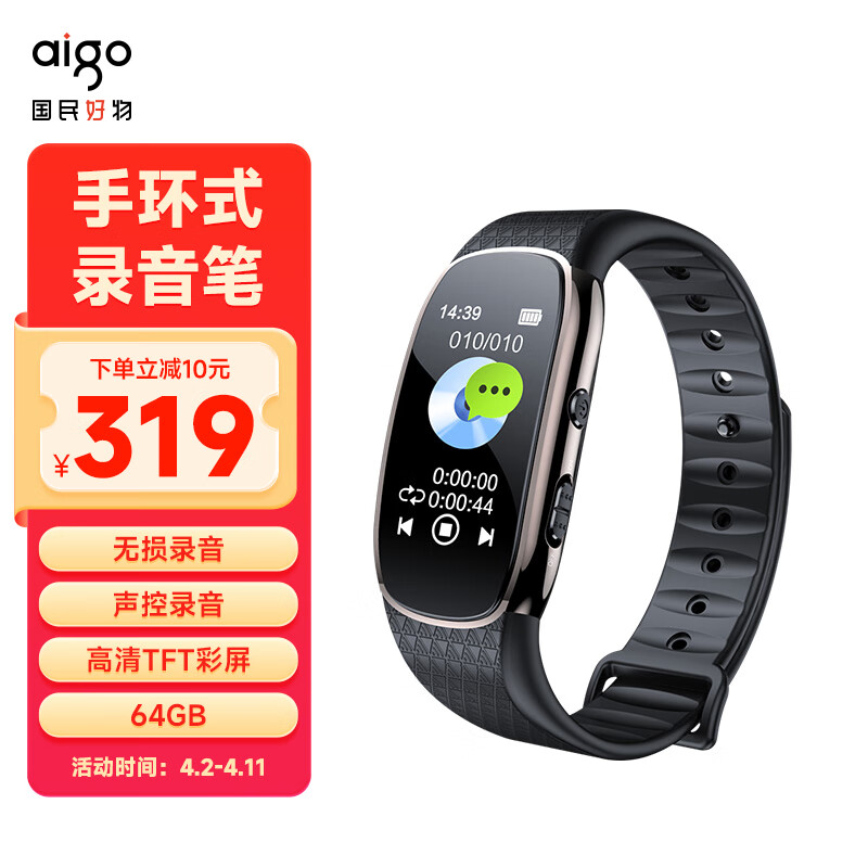 爱国者aigo手表手环式录音笔R6511 64G专业录音器一键录音高清降噪录音 MP3播放器 学习采访会议黑色价格:329.00元!