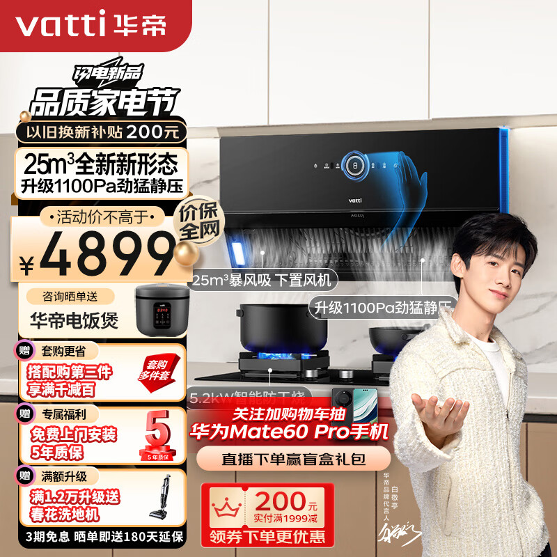 华帝(VATTI)抽油烟机超薄近吸顶侧家用变频大吸力防干烧燃气灶具套装25风量自清洗排油烟机小魔盒C16天然气价格:4899.00元!