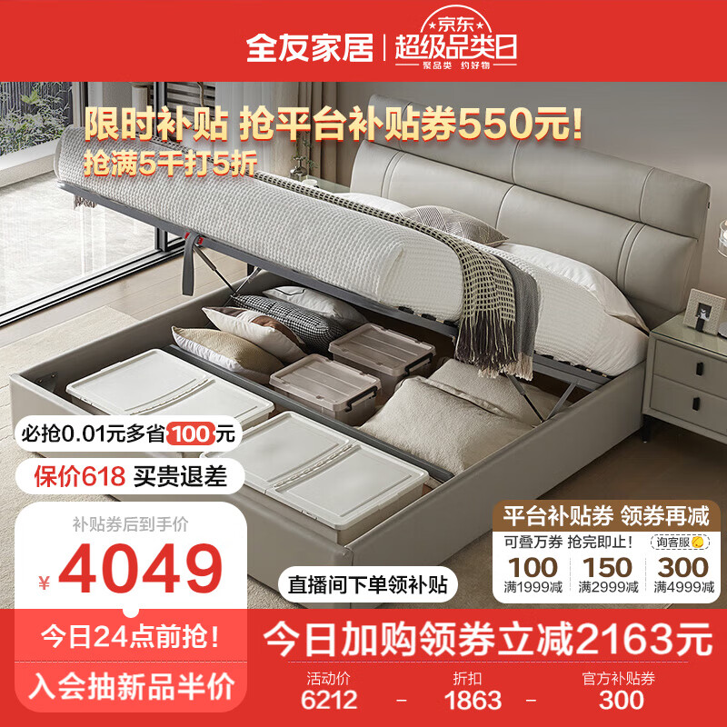 全友家居 真皮艺床头层牛皮现代简约主卧室双人大床高箱储物床105251价格:6212.86元!