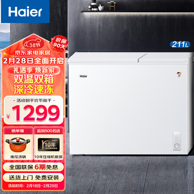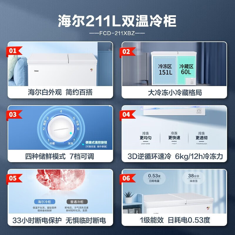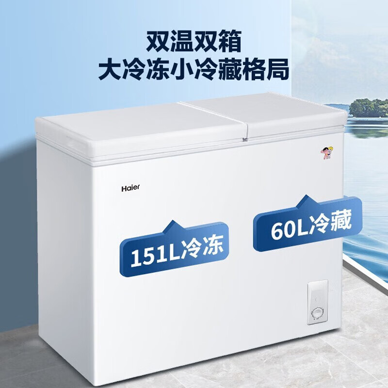 海尔(Haier)冷柜双温柜211升双箱双温商用家用冰柜 大冷冻小冷藏卧式冰箱家用小型一级能效节能省电价格:1249.00元!