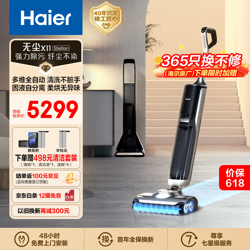 海尔(Haier)无线智能家用洗地机吸洗拖一体自动清洗全自动拖地机扫地机器人自动上下水无尘X11station基站款价格:5399.00元!