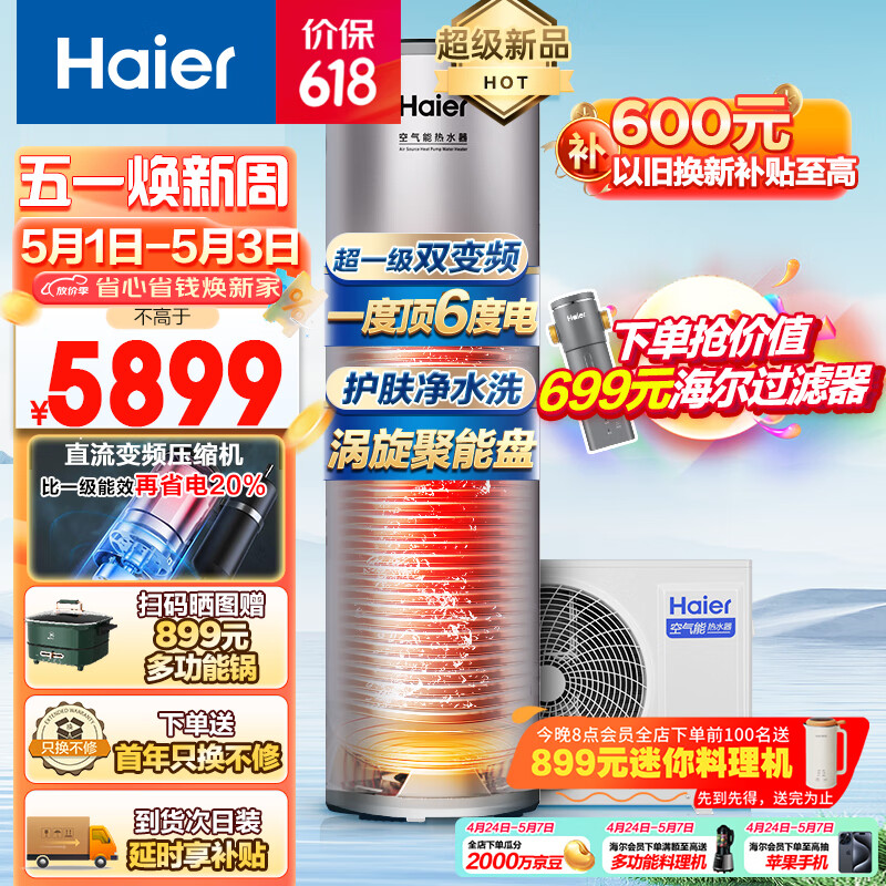 海尔(Haier)空气能热水器200升包安装 超一级能效全变频净水洗 升级R32冷媒 WIFI智控 KF200-T7U1(2-4人)价格:5899.00元!