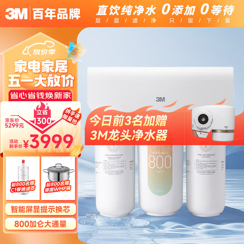 3M净水器家用净水机直饮RO反渗透厨下过滤器800G大通量2L/min家用纯水机HFRO-S823价格:4799.00元!