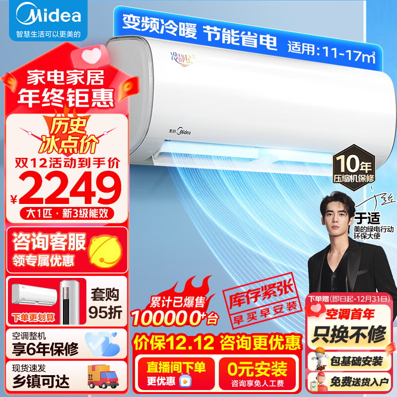 美的(Midea)空调大1匹挂机 冷静星二代 新三级能效 变频冷暖 壁挂式 KFR-26GW/BDN8Y-PH400(3)A 卧室书房空调价格:2249.00元!