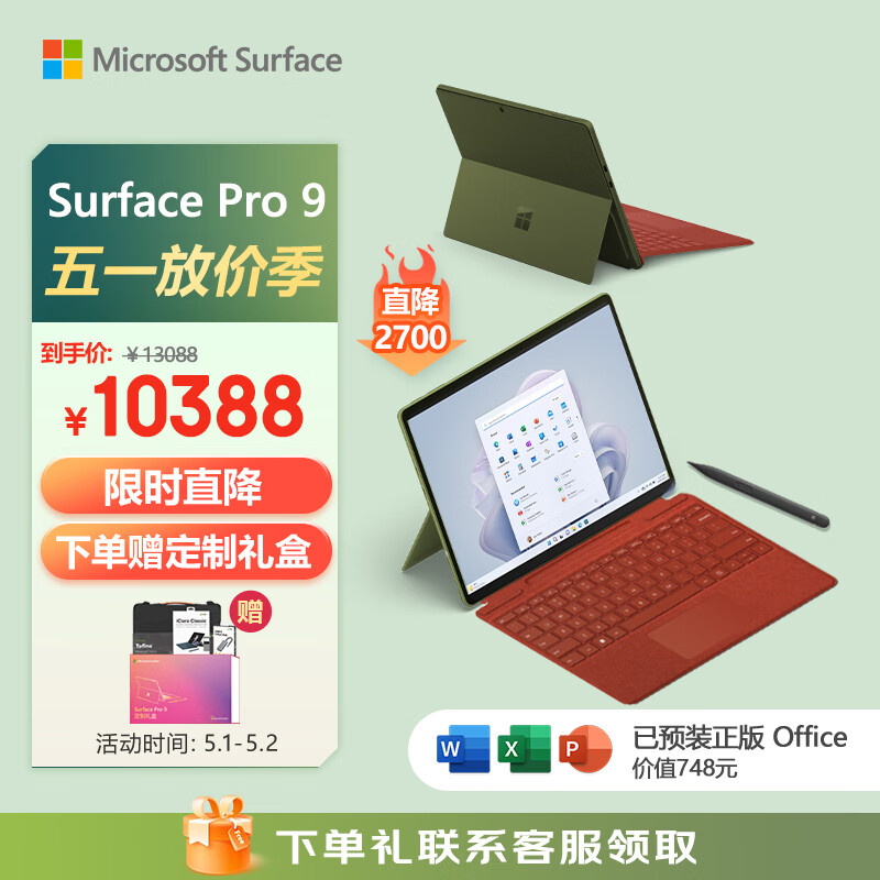 微软Surface Pro 9 森野绿+波比红带触控笔键盘盖i5 16G+256G 二合一平板电脑13英寸120Hz屏高端轻薄本价格:10388.00元!