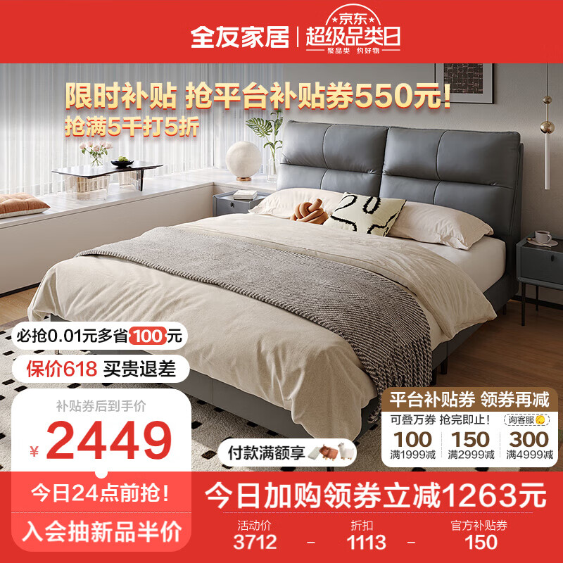 全友家居 头层牛皮现代简约真皮艺软包床1.8x2米主卧室双人大床116019价格:3712.86元!