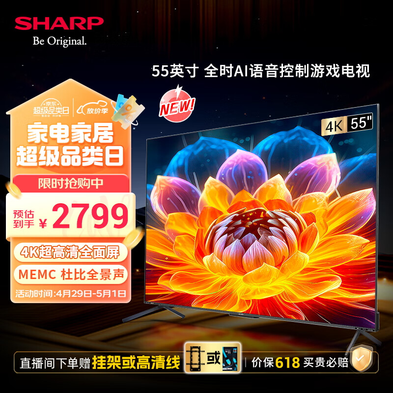 SHARP夏普电视55英寸3+32G HDMI2.1 MEMC HDR10 杜比全景声4K超高清屏液晶平板电视4T-C55FL1A价格:2799.00元!