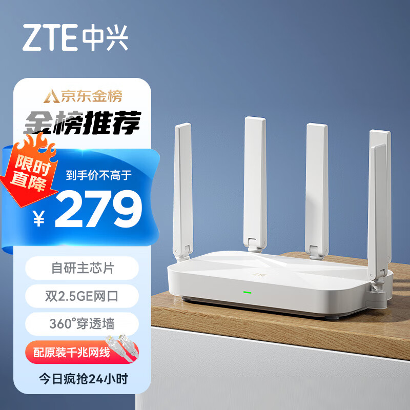 中兴(ZTE) 巡天AX3000Pro+路由器 5G双频超千兆双2.5G Mesh无线路由器 WIFI6 电竞路由穿墙大覆盖价格:279.00元!