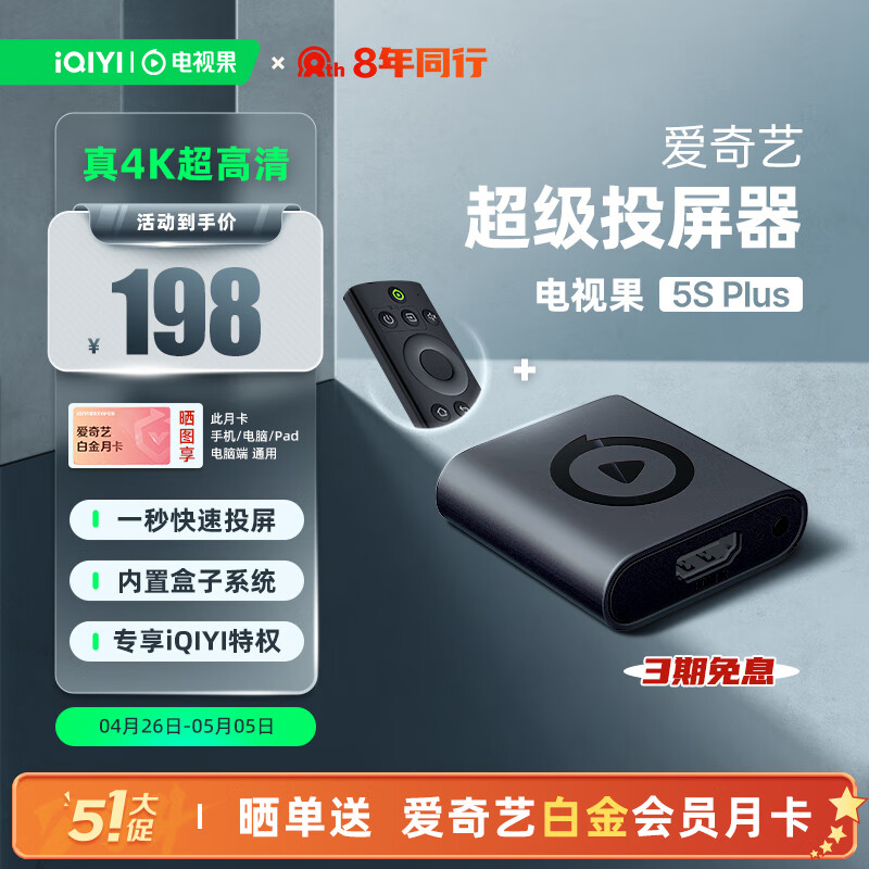 爱奇艺电视果5S PLUS 超级投屏器 手机无线投屏器4K高清HDMI连接器同屏器适用苹果安卓手机电脑接电视显示器价格:198.00元!