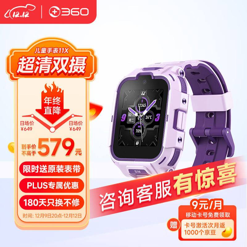 360儿童电话手表11X 高清双摄 儿童定位手表 超长续航 4G通视频通话手表男女 香芋紫价格:599.00元!