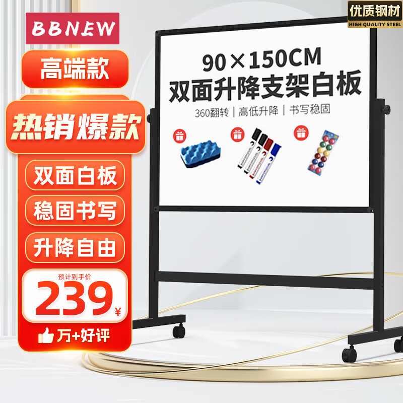 BBNEW 90*150cm 双面磁性白板支架式 可移动升降翻转写字板 会议办公 家用教学儿童黑板NEWV90150价格:239.00元!
