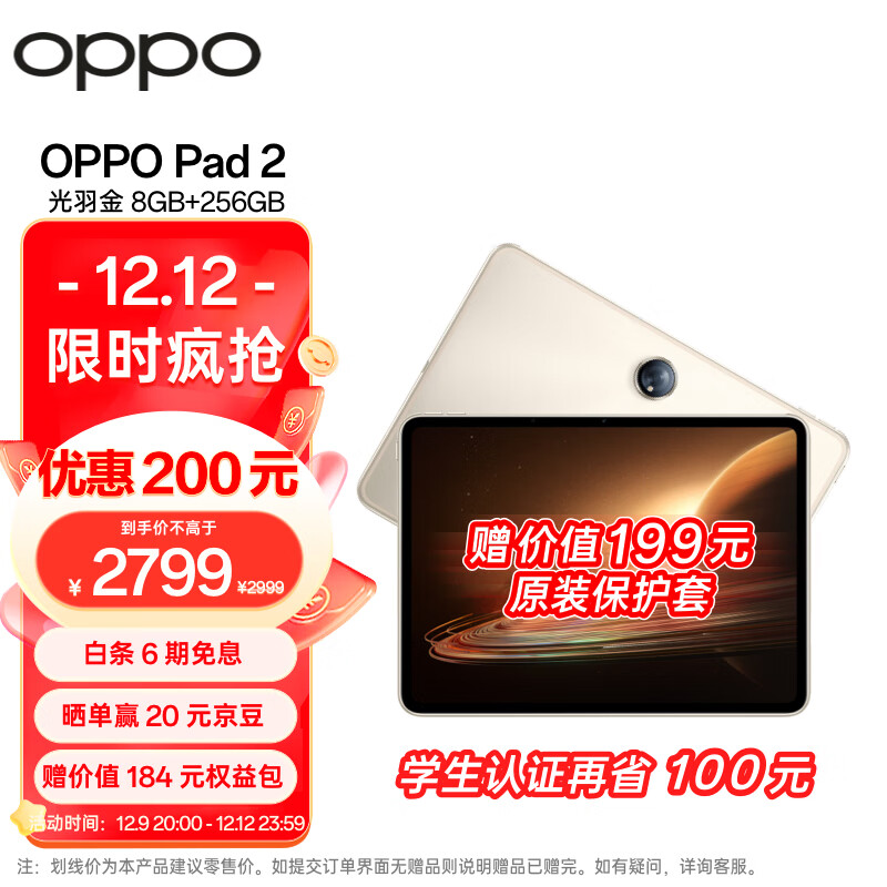OPPO Pad 2平板 11.61英寸2.8K超高清大屏 144Hz超高刷 天玑9000 8GB+256GB光羽金 办公学习娱乐游戏平板电脑价格:2799.00元!