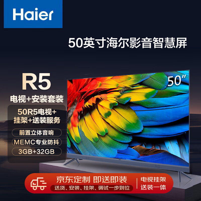 海尔(Haier)安装套装-50英寸3G+32G大内存超薄屏MEMC专业防抖声控音响电视50R5+安装服务【送装一体】价格:1899.00元!